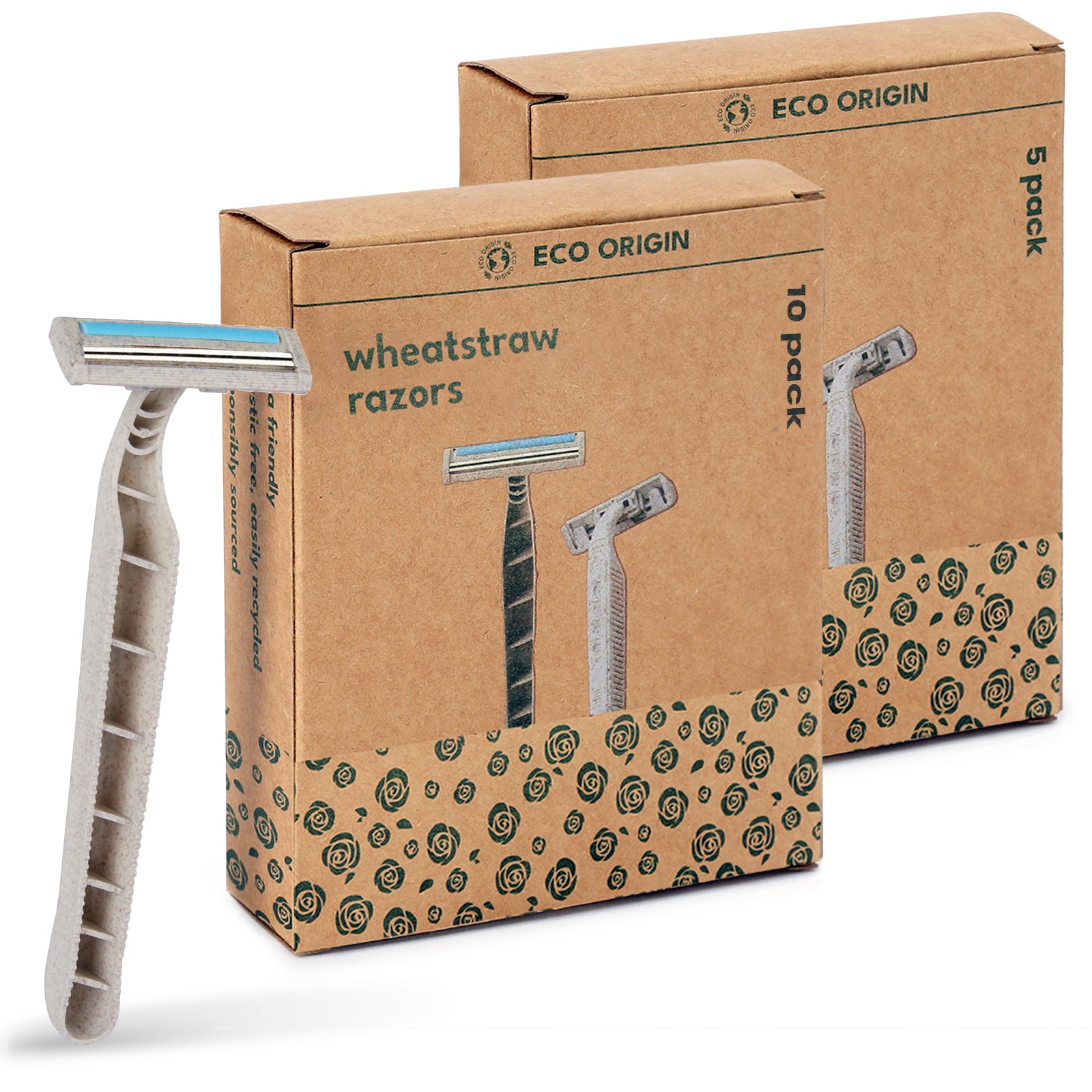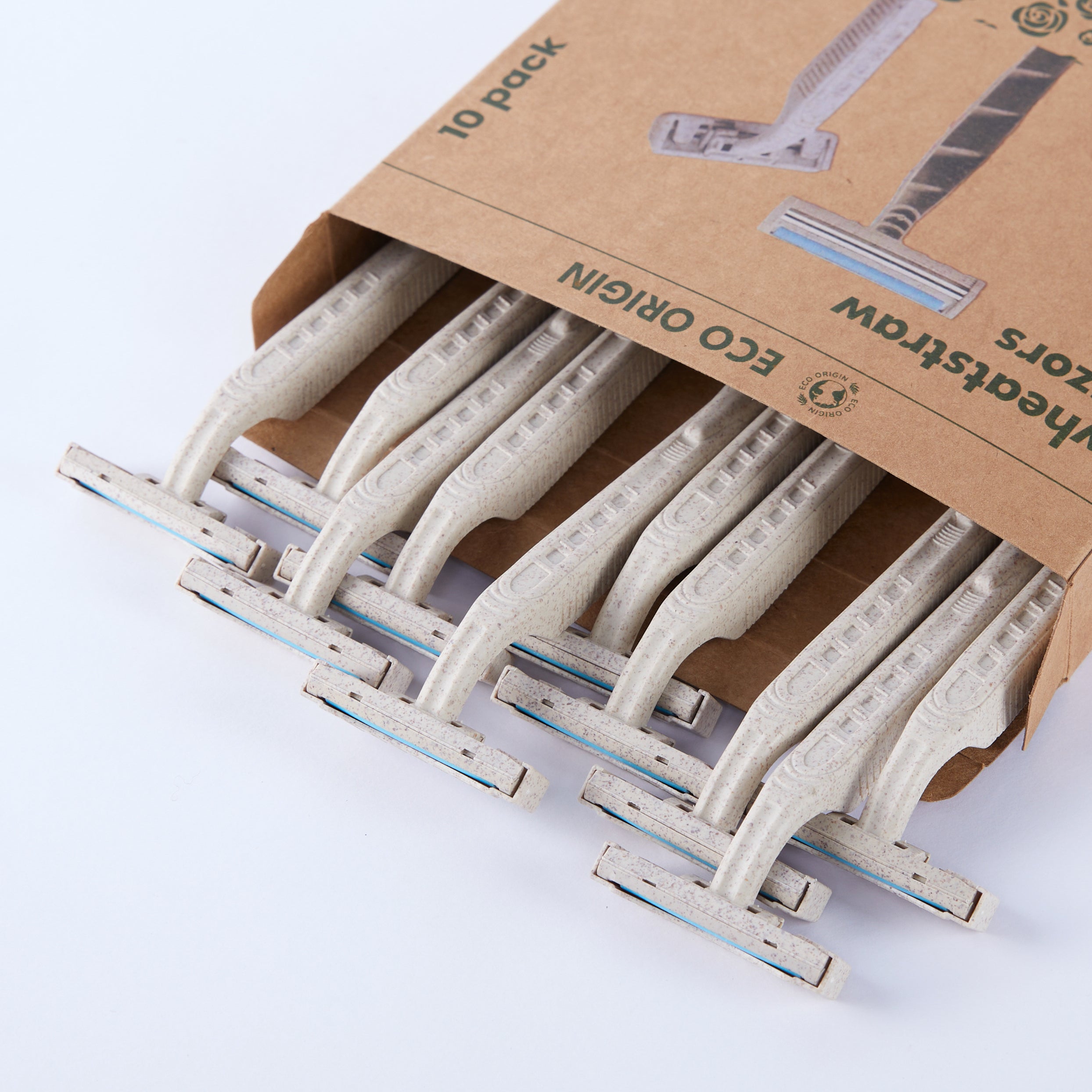 Five-pack or ten-pack of Wheat Straw Disposable Razors for better grooming. Eco-friendly, high-quality razors for sustainable shaving. Free UK delivery.