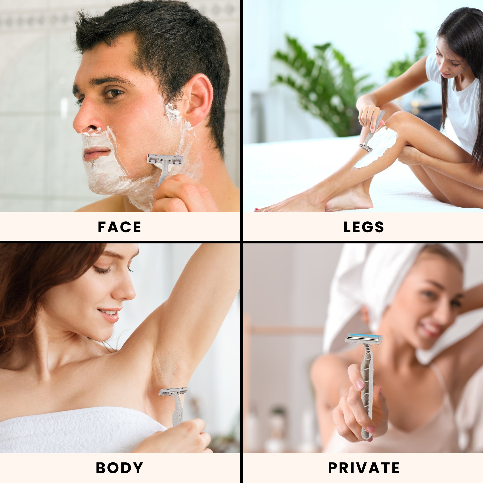 An All-in-One Solution: Whether you want to shave your legs, arms, chest, back, or privates, our twin-blade safety razors give you precise control and a professional finish. Pack them in your luggage while travelling, and you'll be hair-free throughout the trip.